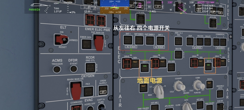 bat为飞机电瓶,EXT为地面电源(游戏默认接通) ( ̄ー ̄)