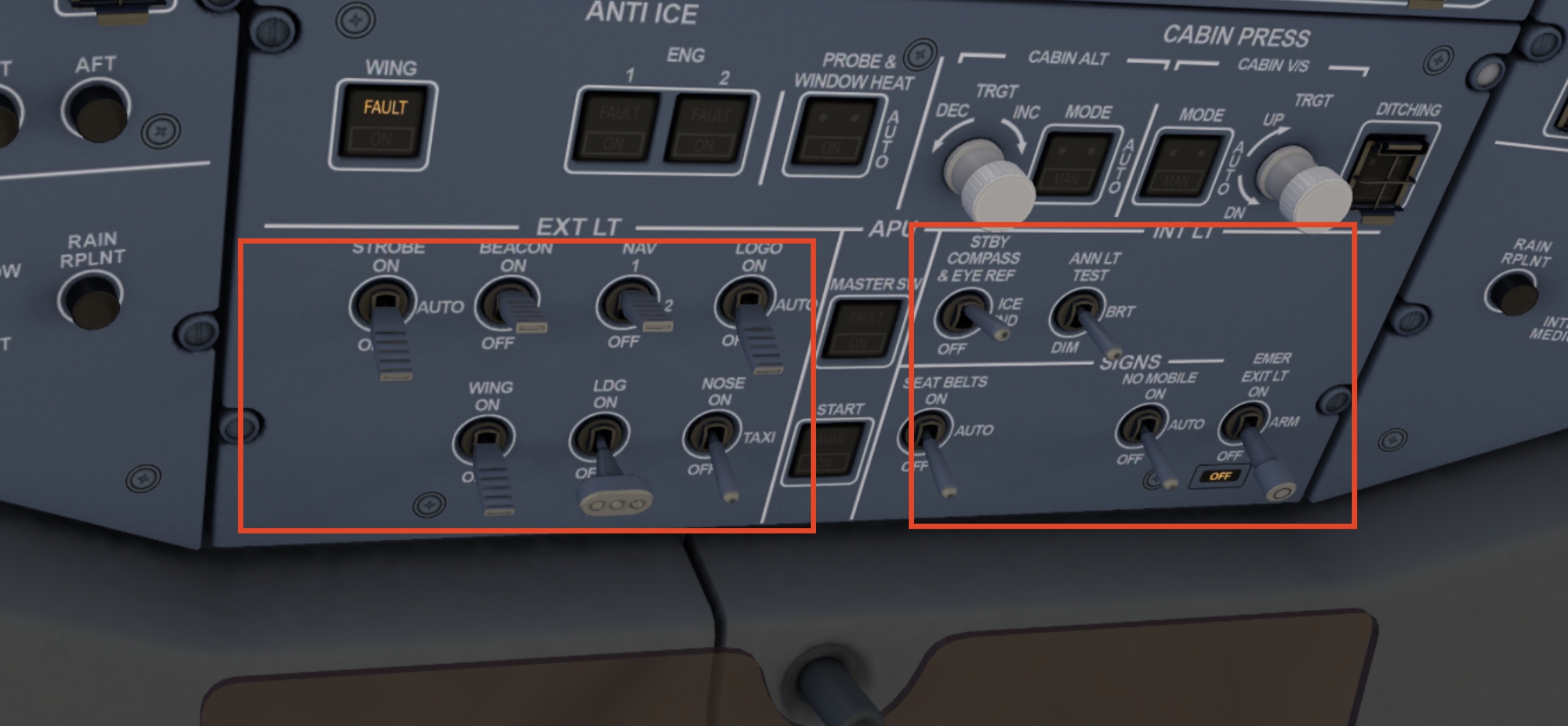 -安全带 灯 以及其它 客舱灯 打开 (左侧为外部灯光,右侧为内部灯光)